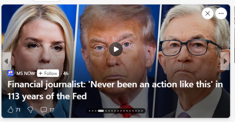 The Justice Department has opened a criminal investigation into Federal Reserve Chair Jerome Powell over the renovation of the Fed’s Washington headquarters. MS NOW Senior Investigative Reporter Carol Leonnig, former U.S. attorney Barbara McQuade, USA Today Washington Bureau Chief Susan Page and veteran financial journalist Ron Insana joins Ana Cabrera to share their reporting and analysis.